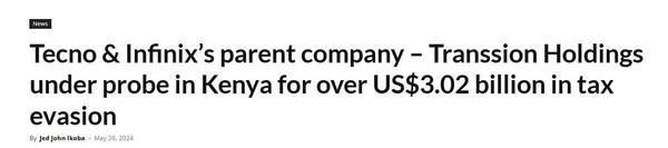 据权威媒体报道,肯尼亚税务局(KRA)已对传音控股展开全面调查,涉嫌逃税金额高达 4000 亿肯尼亚先令(约合 30.2 亿美元)。(手机中国)
