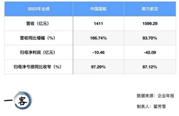 从年报的亏损数据来看,2023年南方航空实现营业收入1599.29亿元,净亏损42.09亿元,较2022年减亏284.71亿元,同比收窄87.12%。