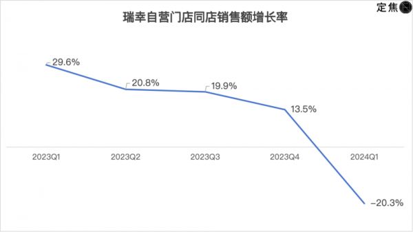 占比三分之二的自营门店,是瑞幸的基本盘,今年Q1,其自营门店的同店销售额增长率成负20%,去年同期为30%。这是瑞幸这一指标近几年来第一次为负,侧面说明瑞幸门店接近饱和。
