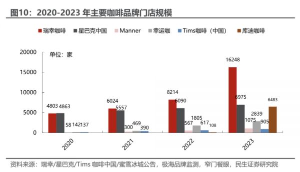 主要咖啡品牌2023年的状态可以总结为:价格战的主力瑞幸和库迪高速扩张;加大促销的星巴克和Tims开店稳中有升,但销售受冲击;蜜雪冰城旗下的平价咖啡幸运咖低价优势被削弱,开店放缓;平价精品咖啡Manner不降价,门店刚破千家。