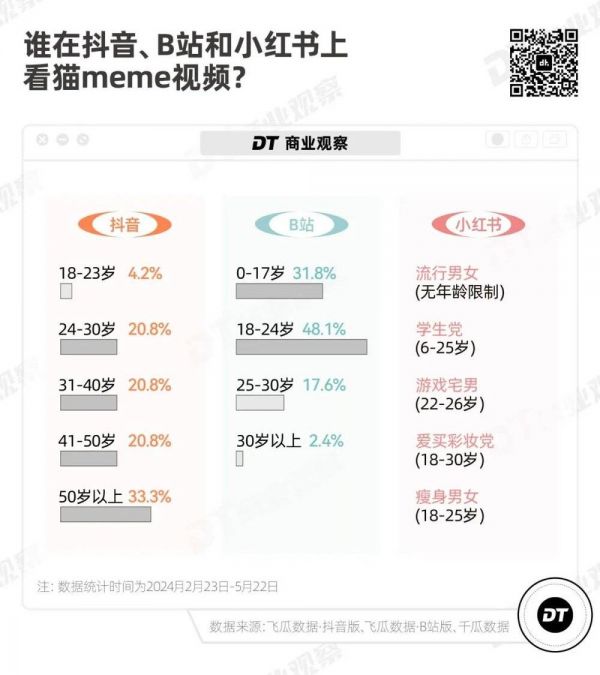 在抖音上,观看猫meme的人群除了18~23岁这一年龄段,在其他年龄段上的人群分布都比较均匀。