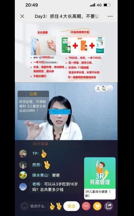 所谓专家在直播课程中介绍相关增高的健康养生知识,并大量利用使用者的案例推荐和证明,进而推出可以增高的产品。