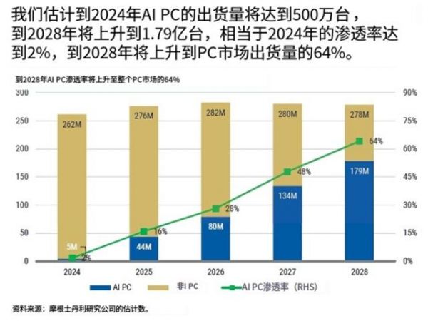 大摩预测,随着处理器和内存的升级,每台人工智能PC的半导体价值将增长20%-30%,PC平均售价也将提高7%。