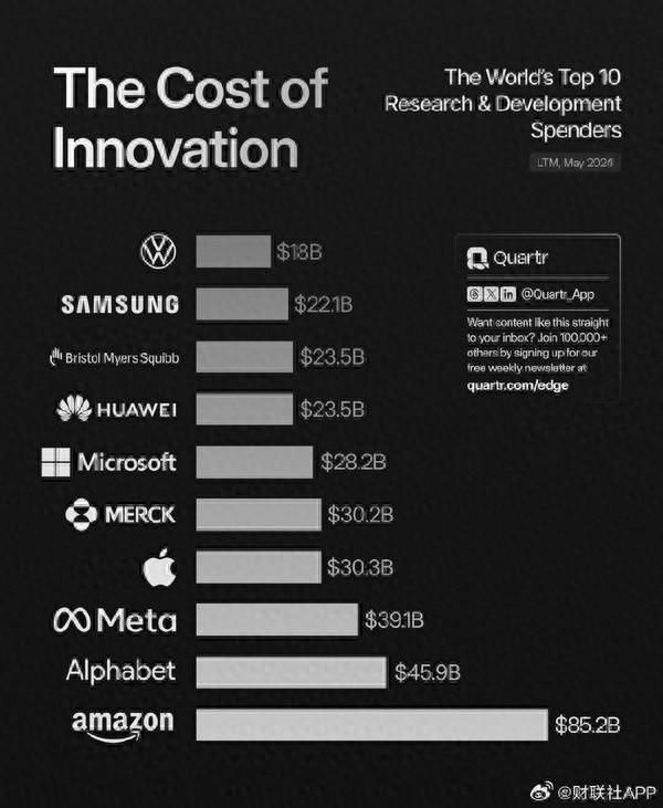 根据Quartr的统计,截止2024年5月,全球在过去一年里在研发支出方面投入最大的十家公司是:亚马逊以852亿美元的研发支出位居榜首,其次是谷歌母公司Alphabet的459亿美元,Meta的391亿美元,苹果的303亿美元,默克的302亿美元,微软的282亿美元,华为的235亿美元,百时美施贵宝的235亿美元,三星的221亿美元,以及大众的180亿美元。