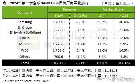 排名第二的是SK集团,其第一季度营收环比增长31.9%,达32.7亿美元,市场份额为22.2%,环比增加了0.6个百分点。而其营收的增长主要受益于智能手机、服务器订单增长,以及收购的Solidigm拥有独特的Floating Gate QLC技术,大容量Enterprise SSD订单动能续强。预计二季SK集团出货的NAND Flash位元增长幅度有望优于其他供应商,营收预计也将继续环比增长20%左右。
