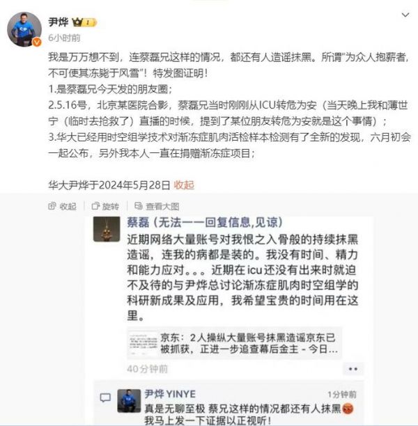截图中蔡磊表示:“近期网络大量账号对我恨之入骨般的持续抹黑造谣,连我的病都是装的。我没有时间、精力和能力应对。近期在ICU还没有出来时就迫不及待与尹烨总讨论渐冻症肌肉时空组学的科研新成果及应用,我希望宝贵的时间用在这里。”
