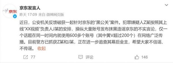 5月27日,@京东发言人 发文称,近日,公安机关反馈破获一起针对京东的“黑公关”案件。犯罪嫌疑人Z某按照其上线“XX视频”负责人J某的安排,操纵大量账号发布抹黑造谣京东的不实言论,仅一个话题在同一时间内就使用600多个账号(其中黄V超过200个)在网络广泛传播。目前警方已抓获Z某和J某,正在进一步追查其幕后金主,希望大家不信谣、不传谣。