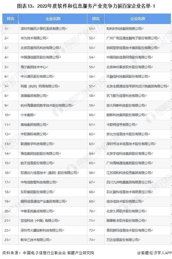 2023 年 9 月,中国电子信息行业联合会发布了《2023 年度软件和信息技术服务企业竞争力报告》。根据《报告》排名,我国软件和信息技术服务竞争力排名前十的企业中为腾讯、华为、百度、中国通信、海尔、网易、浪潮、海康威视和小米。其中,腾讯排名第一。
