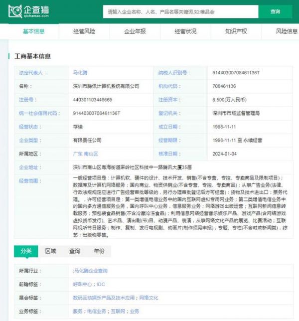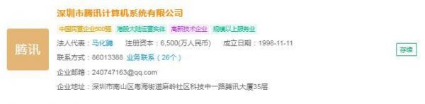 企查猫资料显示,深圳市腾讯计算机系统有限公司成立于 1998 年,总部位于深圳市,法人代表为马化腾,是我国中国民营企业 500 强之一。