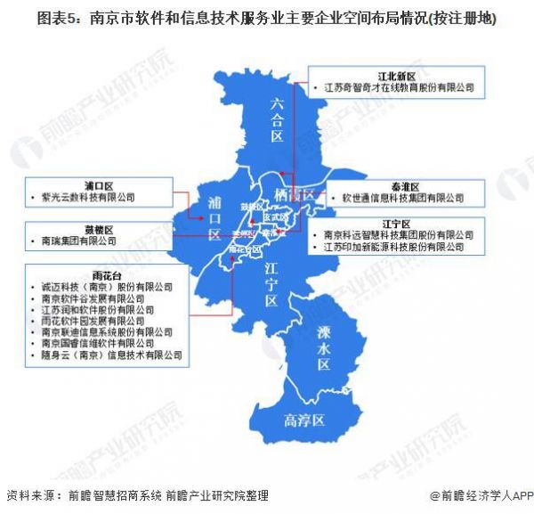 从重点企业的空间布局来看,南京市雨花台区聚集的软件和信息技术服务业企业数量较多,分布有诚迈科技、软件谷、润和软件等企业。