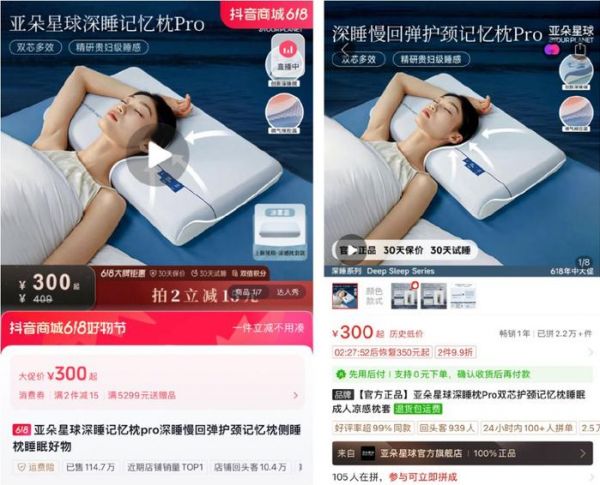 从多个卖货平台看,亚朵星球“深睡枕pro”的618价格均为300元。以抖音平台亚朵星球官方旗舰店为例,这款“深睡枕pro”原价为409元,满减优惠价为300元,而在拼多多亚朵星球官方旗舰店,同款“深睡枕pro”的拼单价格也为300元。