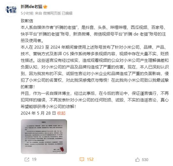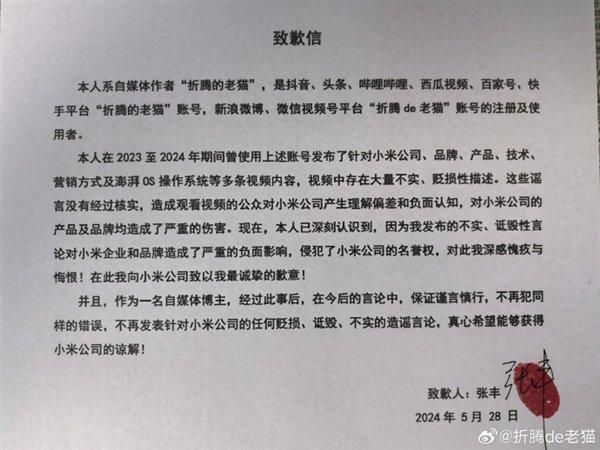 快科技5月29日消息,今日,自媒体博主"折腾的老猫"(本名“张丰”)发布致歉信,对自己此前针对小米的不实言论表示诚挚的歉意。