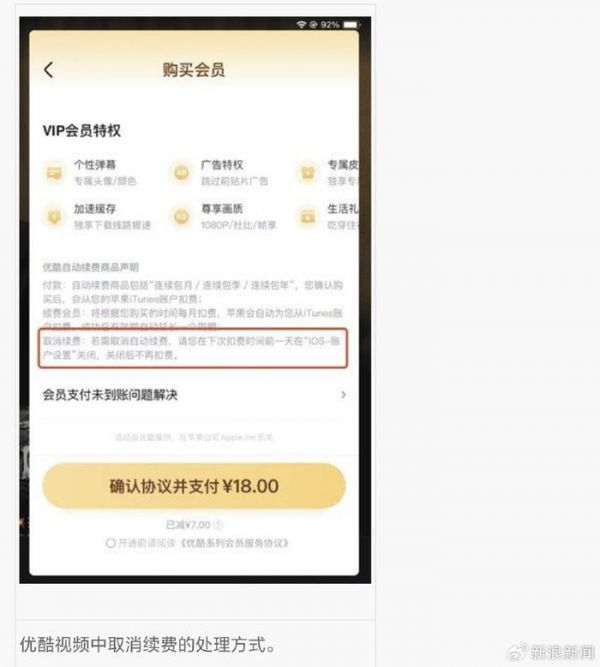 记者在其中一个视频平台体验开通会员看到,支付会员费用前会弹出苹果提示信息,一行小字显示续费日期至少在前一天,可以在苹果ID中取消连续包月。