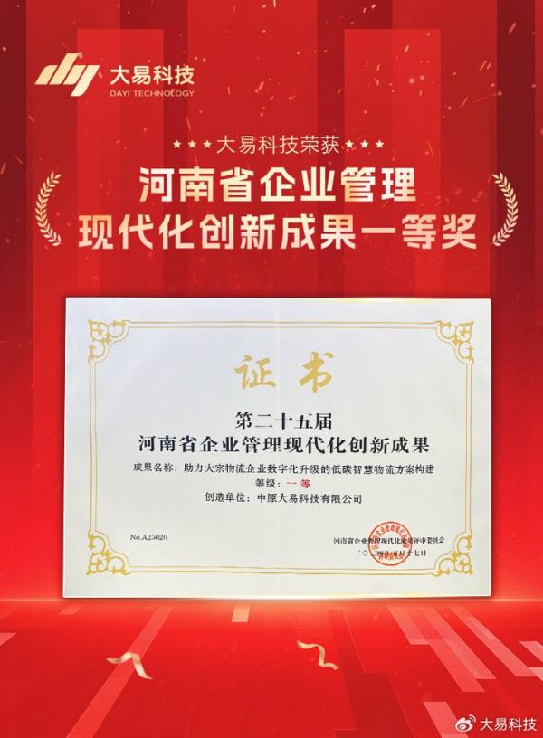 5月30日下午,由河南省企业管理现代化成果评审委员会、河南省企业联合会、河南省企业家协会主办的2024年河南省企业管理创新工作会在驻马店市举办。会上发布了“第25届河南省企业管理现代化创新成果”。大易科技“助力大宗物流企业数字化升级的低碳智慧物流方案构建”荣获一等奖。