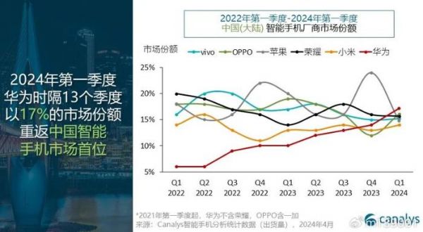 2024年Q1中国手机市场,华为重回第一,苹果跌幅超25%