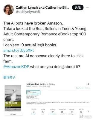 根据独立作家凯特林·林奇(Caitlyn Lynch)2023年6月的统计,彼时亚马逊上“青少年浪漫”的类型下,畅销排行榜的前100本电子书中,有约八成都是语无伦次的,看起来很像是AI生成的。