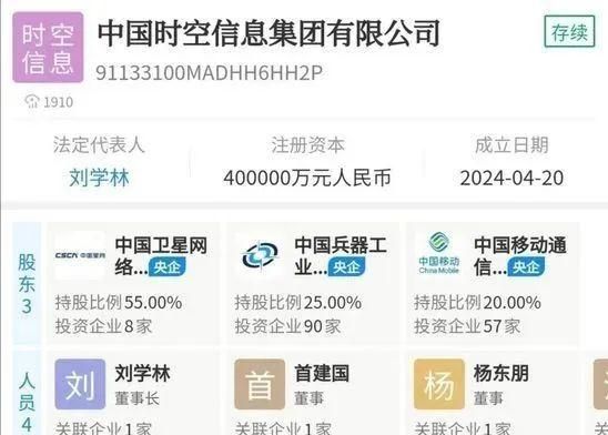 根据企查查信息显示,中国时空信息集团有限公司成立于2024年4月20日,法定代表人为刘学林,注册资本为40亿人民币,企业地址位于河北省雄安新区容城县启动区卫星互联网001号,所属行业为电信、广播电视和卫星传输服务。