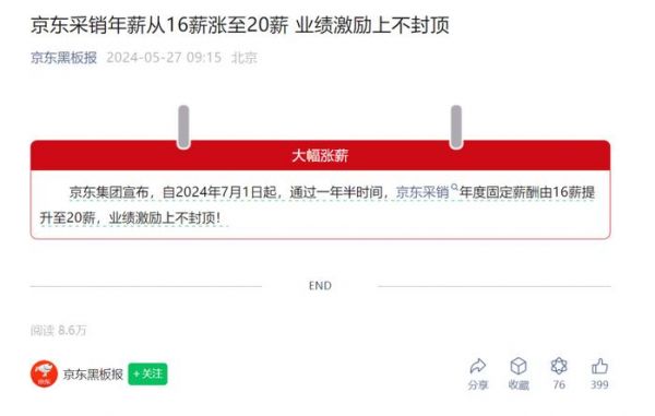 再到近日,京东又宣布自2024年7月1日起,通过一年半时间,京东采销年度固定薪酬由16薪提升至20薪,业绩激励上不封顶。