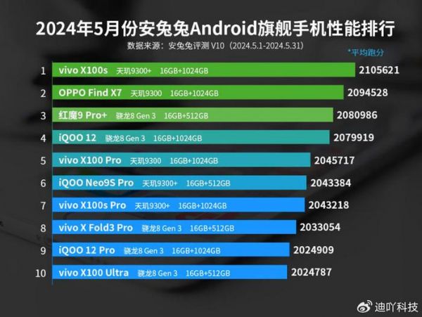 从目前的手机旗舰手机性能榜中,vivo X100s凭借搭载的天玑9300+处理器成功登顶,平均跑分高达2105621分。