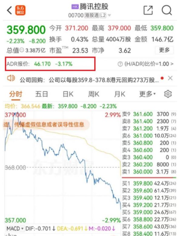 受上述消息影响,腾讯5月31日股价由涨转跌,截至收盘,腾讯控股报收359.8港元/股,下跌2.23%。当晚,腾讯控股ADR继续大跌,截至晚间10:30,股价大跌超3%。