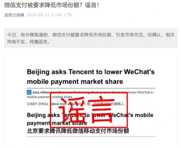 5月31日晚间,腾讯通过微信官方辟谣平台回应微信支付被要求降低市场份额的传闻,“经确认,相关传闻不实,纯属谣言。”