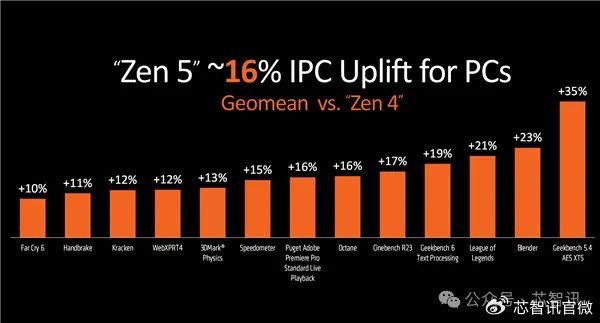 根据AMD官方测试,其Zen 5内核面向PC平台的IPC性能相比Zen 4平均提升了约16%。