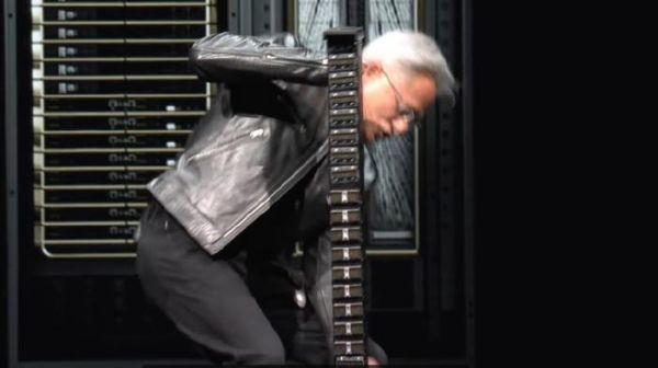 他一会儿跑下台,把一块名为「Blackwell」的芯片搬到舞台上,介绍它如何通过NVLink交换器把两个裸晶(Die)连接在一起创造更大算力,说它是「世界上有史以来最复杂、性能最高的芯片」,能够支持兆级参数规模的生成式AI;一会儿,他又跑到舞台左边,站在一个货柜一样的东西旁,开始推荐一个叫「DGX Blackwell」的设备,它的算力更加庞大,甚至可以满足一家AI公司的需求,因为它通过NVSwitch连接了72个Blackwell芯片;之后,他来到舞台右边,那里已经为他准备好一个长方形铁架,他费劲地把它扛到舞台中央,宣布它就是那个能连接一切的「脊柱」,其中有5000条连接线,加起来有两英里长。他声称,如果把多台「DGX Blackwell」再连接起来,就能构成一个庞大的数据中心——黄仁勋称之为「AI工厂」。