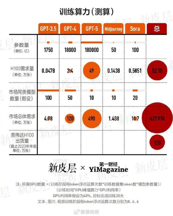 按照「所需H100数量=(训练阶段每token浮点运算次数×训练数据集token数×模型参数量)÷(训练时间×H100峰值算力×H100利用率)」的公式粗略计算,要训练完上述规模和数量的大模型,全球需要消耗大约630万枚H100芯片。