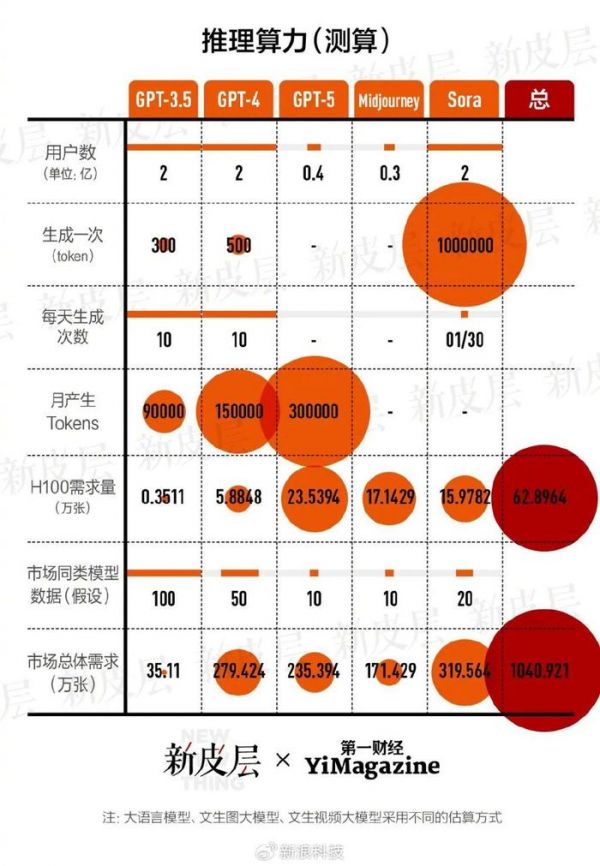 而推理环节需要消耗的算力更高,弹性也更大——这种弹性主要来自于视频的生成,因为每生成一次视频产生的token量几乎是生成一次文字的token量的1000倍。以Sora为例,假如每人每月仅生成一条视频,同时假设市场上最终只有20个相似模型提供服务,并且市场上共有2亿用户在使用这种服务,那么市场需要的H100数量约为320万枚;但如果视频生成技术成熟以及普及到有数十亿人使用,并且每个用户每天都会用它生成视频,甚至不止生成一条,那相应的算力消耗会增加至少两个数量级。