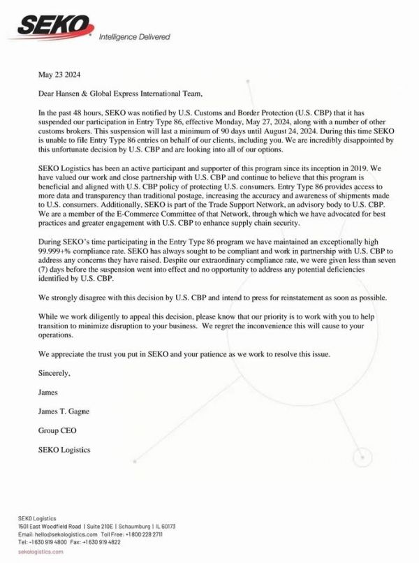 另一方面,CBP对“小额豁免”清关的关停,也引起了SEKO物流等国际货运代理商的不满。