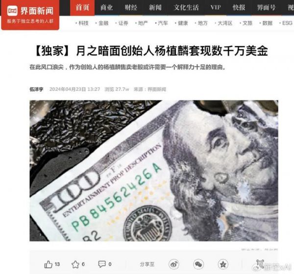 但是随后也被曝光,自2月完成最新一轮融资以来,公司创始人杨植麟及相关人员通过出售个人持股已套现数千万美元。传闻具体金额高达4000万美元,折合人民币近3亿元。