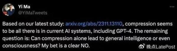 2023 年底发表白盒大模型框架 CRATE 时,马毅在社交媒体上称压缩不会通向通用智能或意识。