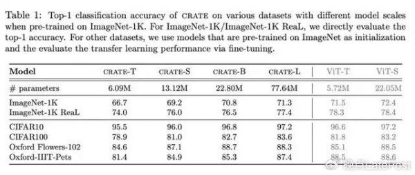 2023 年底发表的论文 White-Box Transformers via Sparse Rate Reduction 中,不同版本的 CRATE 和 ViT 在 ImageNet-1K 数据集上的图像分类任务准确率比较。