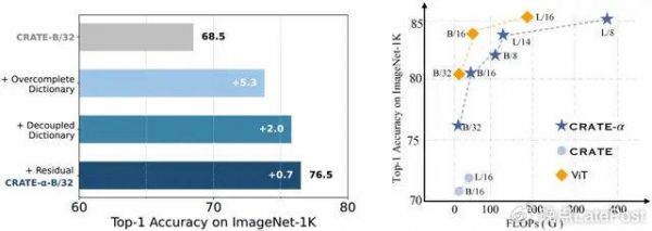 比如我们最近就有新成果,前几天刚发布了 CRATE-α。简单调整一些编码方式后,CRATE-α 的性能已经可以与 ViT 媲美。