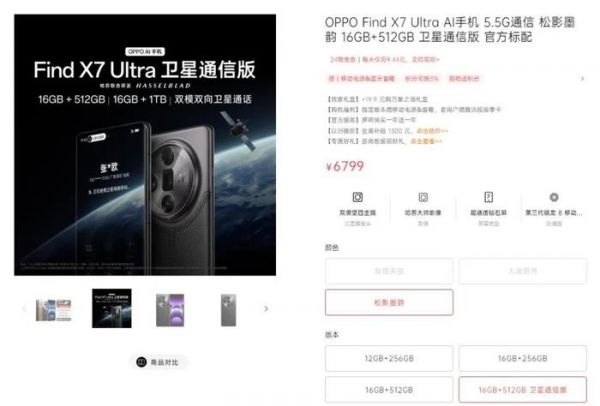 有意思的是,继1TB版本后,OPPO又在官方商城开售了512GB存储的Find X7 Ultra卫星通信版,6799元的定价比之前非卫星通信的512GB价格还便宜了200元,出现了卫星通信版价格倒挂的现象。