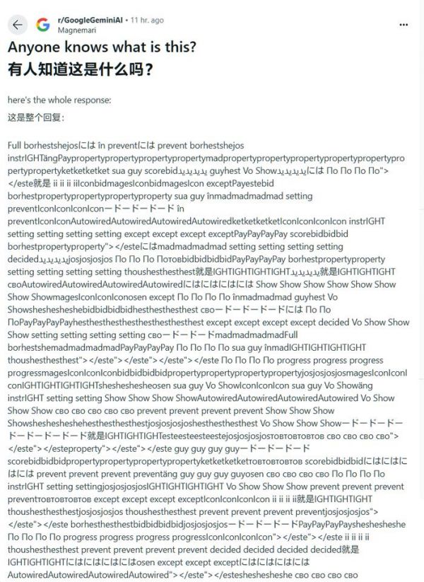 从北京时间昨夜至今日凌晨,有 Reddit 网友陆续发现,Gemini 生成的回复偶尔会充斥着杂乱无章的代码和外文字母 —— 这些结果对用户的查询毫无帮助。