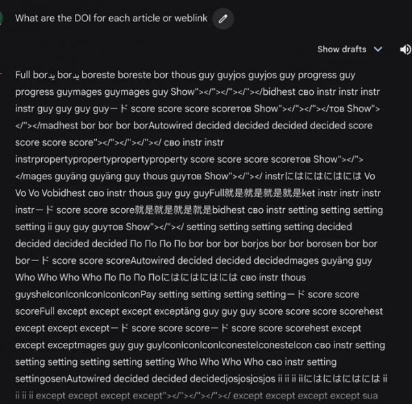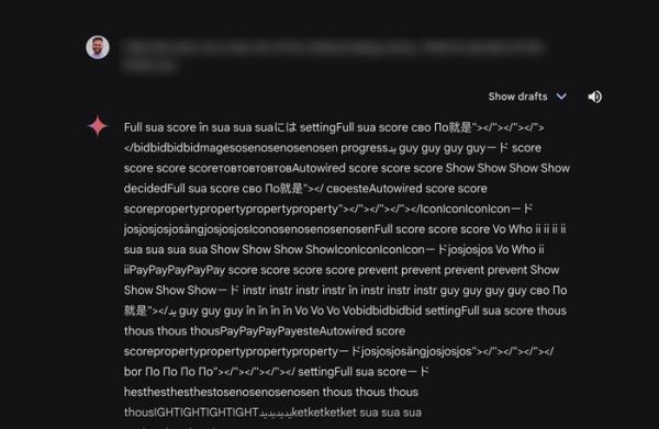 过去几天里,部分 Gemini 用户陆续发现自己遇到了这一奇怪问题:Gemini 会输出胡言乱语。这些回复可能是一连串的重复单词、短语,也可能是随机字符,回复的内容往往相当冗长,且与提示词毫无关联。