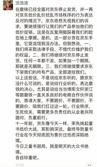 磨铁表示不干,CEO沈浩波表示,将无限期停止对京东发货,还说,“强行让我们的产品参加他们的底价促销,这是在反复用脚踩着我们的脸在地上摩擦。”