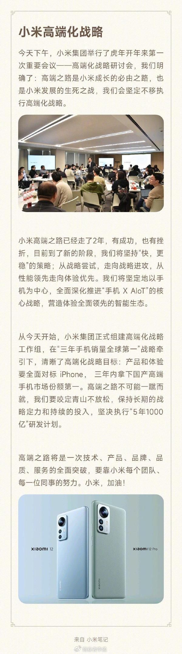 2022年2月,雷军称“三年内拿下国产高端手机市场份额第一”,小米能做到吗?2022年2 月 8 日,小米创办人、董事长兼 CEO 雷军宣布,今天下午,小米集团举办了虎年开年来第一次重要会议 —— 高端化战略研讨会,明确了:高端之路是小米成长的必由之路,也是小米发展的生死之战,会坚定不移执行高端化战略。雷军表示,从今天开始,小米集团正式组建高端化战略工作组,在「三年手机销量全球第一」战略牵引下,清晰了高端化战略目标:产品和体验要全面对标 iPhone,三年内拿下国产高端手机市场份额第一。高端之路不可能一蹴而就,我们要咬定青山不放松,保持长期的战略定力和持续的投入,坚决执行「5 年 1000 亿」研发计划。