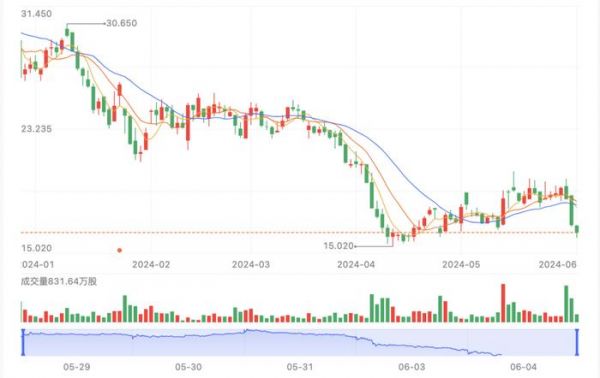 受业绩承压影响,东方甄选近日股价一路走低。6月3日,该公司收盘时跌幅达到9.92%,报收16.52港元,单日市值缩水超18亿港元。6月4日上午,东方甄选股价仍一路走低,截至记者发稿,跌至15.86港元,下跌4.00%。记者注意到,自今年1月份75.55港元的高点以来,该公司股价已跌超78%。