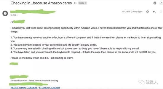 目前在Google任职高级工程师的张天(化名)在本周偶然打开email的时候发现了这样一则来自亚马逊HR的消息: