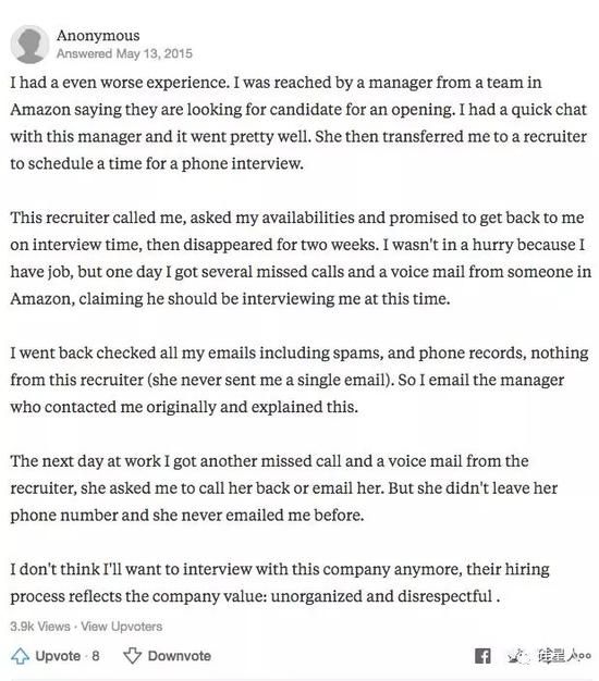 2015年一位亚马逊应聘者在美国知乎Quora上回复关于“面试亚马逊最差的体验”中表示: