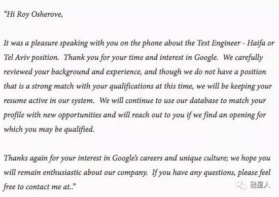 例如Google就是永远地客客气气,追求政治正确,像个谦谦君子,连给出的据信都让人挑不出毛病。 看看下面这封据信,大致意思就是不是你不好,是我们的职位配不上你。