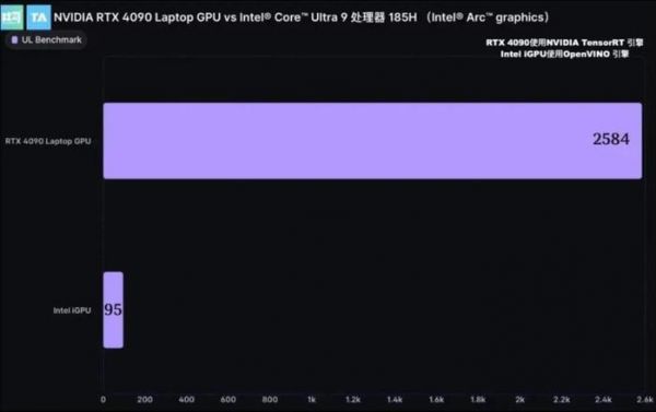根据在线生图AI模型社区吐司发布的《个人用户玩转Stable Diffusion 的GPU配置推荐》,在UL Benchmark SD1.5 TRT vs. OpenVINO的对比测试中RTX 4090笔记本电脑GPU相对于英特尔Ultra 9 185H的内置GPU有超过27倍的性能提升。