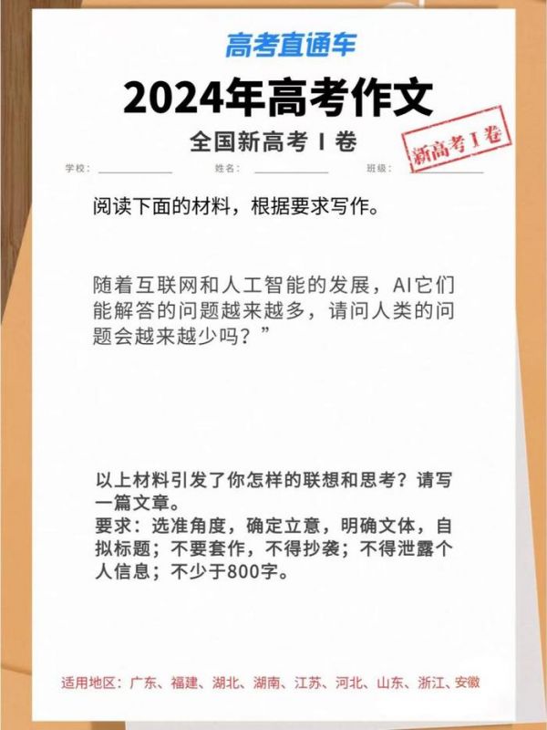 6月7日上午,2024高考打响第一枪,语文作文命题备受关注。今年全国高考作文I卷的命题是基于当下互联网和人工智能发展,AI能解答的问题越来越多,是不是意味着人类的问题越来越少。该命题既包含辩证逻辑关系,又很考验考生的想象力,出题刁钻。有网友表示:“还好当年毕业早,现在拿到这个作文题目一时不知如何下笔。”