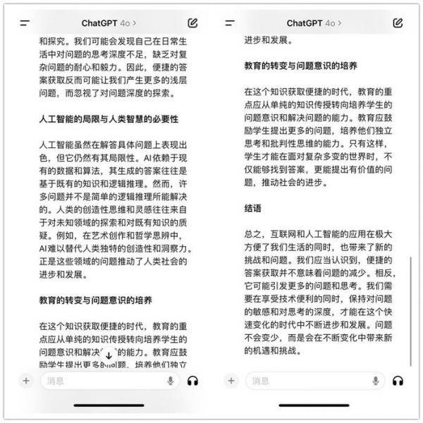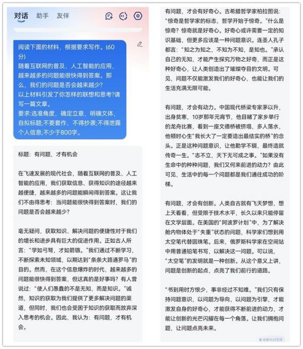 GPT4-o生成的这篇作文题目是“问题会变少吗?”,标题相对肤浅直白。接着是内容,它以分段式结构阐述了人工智能与人类关系,前两段的核心是人工智能对人类的帮扶作用,主要体现在便捷的答案获取机制与便捷的知识传播效率。后两段说明了人工智能的局限与人类智慧的必要性,以及教育的转变与问题意识的培养,但字里行间缺乏深度,看起来比较空洞,“AI”味儿很浓。