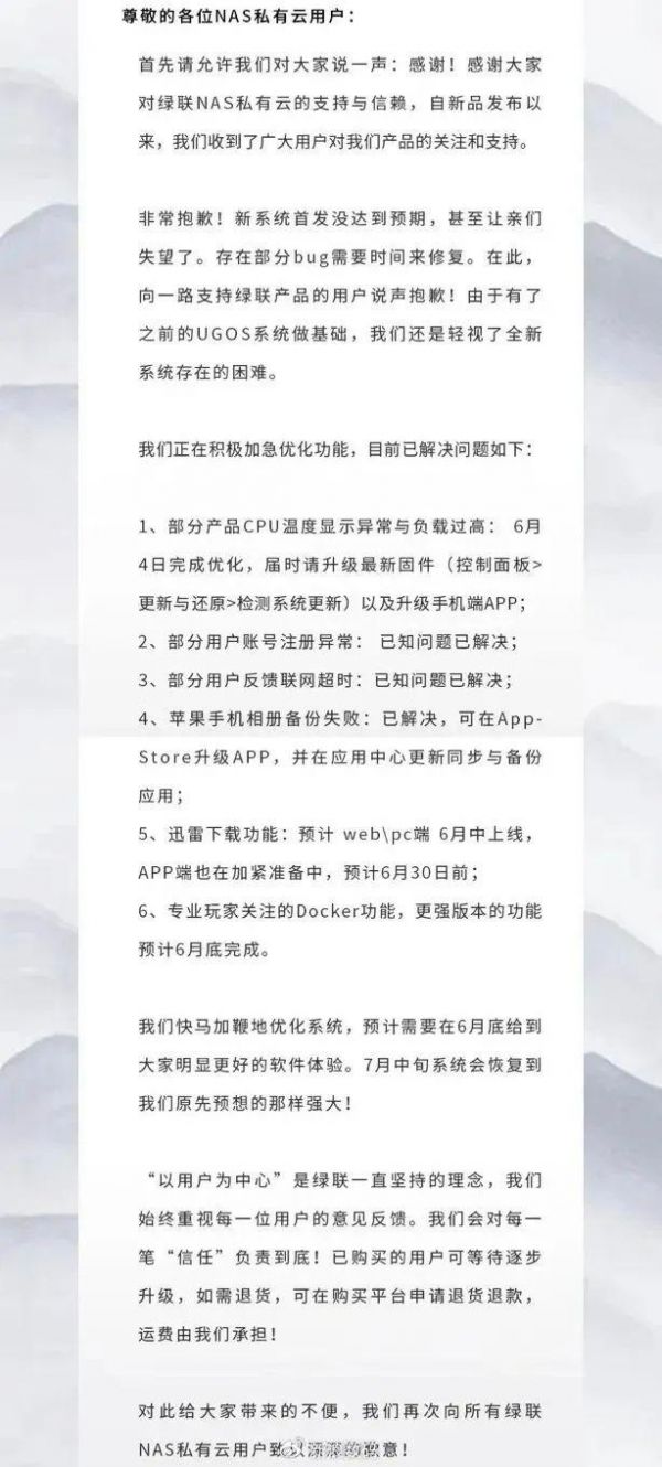 6月3日晚上绿联被喷的把新 NAS 京东天猫全部下架,并发布了致歉信。