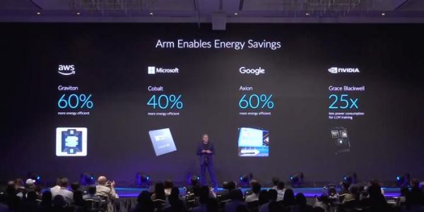 Rene Haas展示Arm架构处理器能效Arm诞生于以电池供电设备为目标客户的市场,长期为物联网等追求低功耗的边缘设备,以及智能手机等兼顾高性能和长续航能力的移动智能设备提供计算解决方案。如今,Arm希望将能效表现的优势延伸到数据中心领域。Rene Haas现场披露的数据显示,云服务厂商亚马逊、微软、谷歌基于Arm架构自研的Graviton、Cobalt、Axion处理器,在能效表现上分别较上一代产品提升60%、40%和60%,英伟达基于Arm架构研发的Grace Blackwell平台训练大语言模型的能耗较上一代架构降低到二十五分之一。