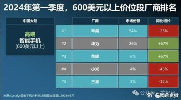 2024Q1全球高端智能手机市场:华为与荣耀均进入前五!