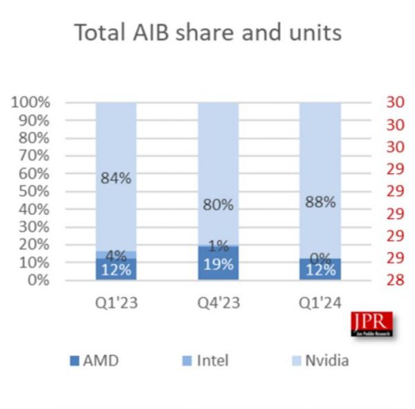 Jon Peddie Research 分析师 C. Robert Dow 补充道:“第一季度 AIB 市场出现了一些积极迹象,因为附加率比 23 年第四季度上升了 6%,比去年同期上升了 10%。价格在本季度也保持稳定,这对消费者来说是好事。”